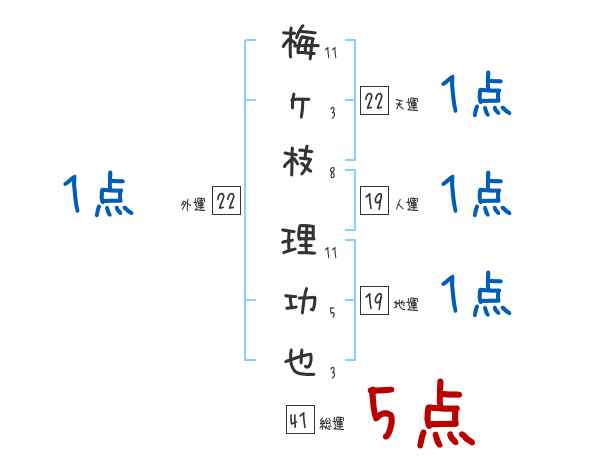外運![]() | 梅ヶ枝理功也さんの外運は22画の1つ星!努力することが苦手ないっぽう手先が器用。芸術性にも優れる。 生活面を象徴する運勢です。外部から受ける影響力を表し、結婚運、家庭運や職場、環境への順応性を表します。 |