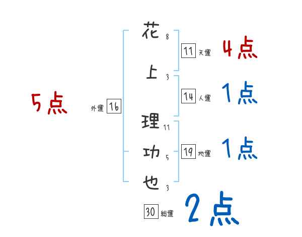 外運![]() | 花上理功也さんの外運は16画の5つ星!人望が厚く大きく発展する。逆転成功が見える。 生活面を象徴する運勢です。外部から受ける影響力を表し、結婚運、家庭運や職場、環境への順応性を表します。 |