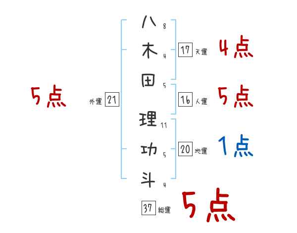 人運![]() | 八木田理功斗さんの人運は16画の5つ星!人望が厚く大きく発展する。逆転成功が見える。 性格や才能などを表す2番目に重要な運勢です。人間関係や協調性、社会的な成功に影響します。主に20歳から50歳ぐらいまでの中年期の運勢を表します。 |