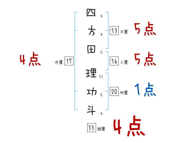外運![]() | 四方田理功斗さんの外運は17画の4つ星!積極的な行動力。地位を気づき財産を手に入れる。純粋な心と直感力。 生活面を象徴する運勢です。外部から受ける影響力を表し、結婚運、家庭運や職場、環境への順応性を表します。 |