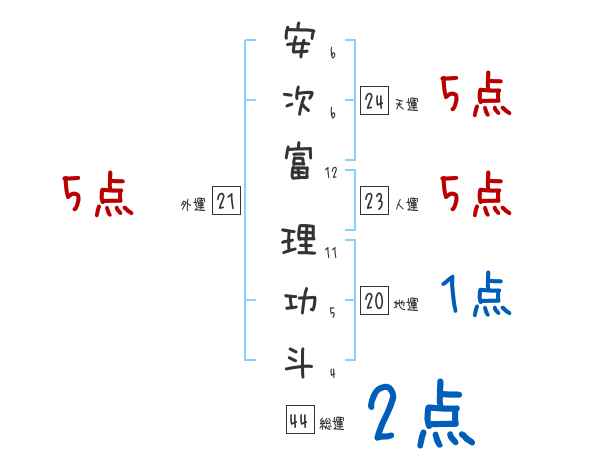 天運![]() | 安次富理功斗さんの天運は24画の5つ星!家庭運が良く順調な人生。金運にも恵まれる。 家系が持つ宿命的な運勢を表します。祖先から受け継いだ苗字ですので自分の力が及びません。家柄を象徴します。 |