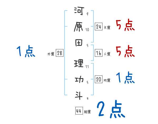 天運![]() | 河原田理功斗さんの天運は24画の5つ星!家庭運が良く順調な人生。金運にも恵まれる。 家系が持つ宿命的な運勢を表します。祖先から受け継いだ苗字ですので自分の力が及びません。家柄を象徴します。 |