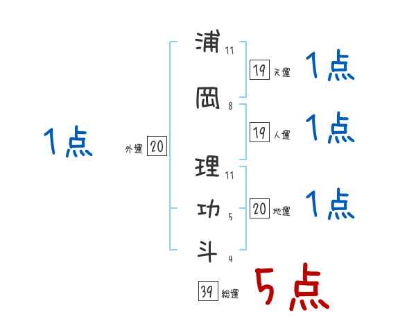 人運![]() | 浦岡理功斗さんの人運は19画の1つ星!優れた才能を持ちますが、協調性が足りないことも。周りの人と協力する事を意識しましょう。 性格や才能などを表す2番目に重要な運勢です。人間関係や協調性、社会的な成功に影響します。主に20歳から50歳ぐらいまでの中年期の運勢を表します。 |