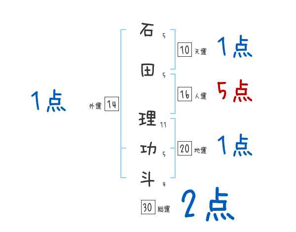 外運![]() | 石田理功斗さんの外運は14画の1つ星!人に対して優しいがストレスを溜め込みがち。人間関係のトラブルを避けるよう気をつけましょう。 生活面を象徴する運勢です。外部から受ける影響力を表し、結婚運、家庭運や職場、環境への順応性を表します。 |