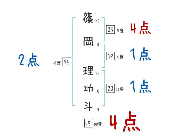 外運![]() | 篠岡理功斗さんの外運は26画の2つ星!波瀾万丈かも。信頼できる人を大事にしましょう。 生活面を象徴する運勢です。外部から受ける影響力を表し、結婚運、家庭運や職場、環境への順応性を表します。 |