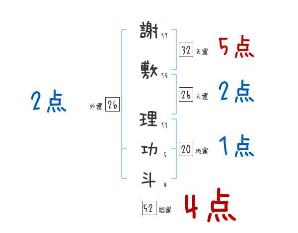 人運![]() | 謝敷理功斗さんの人運は26画の2つ星!波瀾万丈かも。信頼できる人を大事にしましょう。 性格や才能などを表す2番目に重要な運勢です。人間関係や協調性、社会的な成功に影響します。主に20歳から50歳ぐらいまでの中年期の運勢を表します。 |