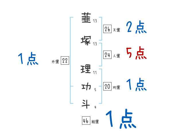 外運![]() | 韮塚理功斗さんの外運は22画の1つ星!努力することが苦手ないっぽう手先が器用。芸術性にも優れる。 生活面を象徴する運勢です。外部から受ける影響力を表し、結婚運、家庭運や職場、環境への順応性を表します。 |