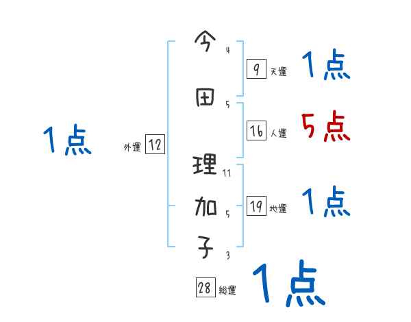 人運![]() | 今田理加子さんの人運は16画の5つ星!人望が厚く大きく発展する。逆転成功が見える。 性格や才能などを表す2番目に重要な運勢です。人間関係や協調性、社会的な成功に影響します。主に20歳から50歳ぐらいまでの中年期の運勢を表します。 |