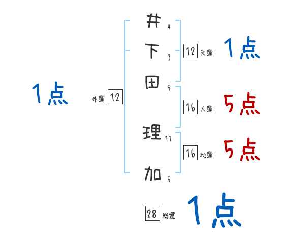 地運![]() | 井下田理加さんの地運は16画の5つ星!人望が厚く大きく発展する。逆転成功が見える。 個性を表す基礎的な運勢です。性格形成や対人関係、行動力など家庭環境に影響されます。主に誕生してから20歳くらいまでの若年期の運勢を表します。 |