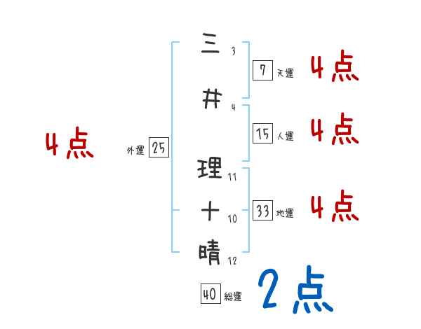 天運![]() | 三井理十晴さんの天運は7画の4つ星!強い意志や信念を持ち独立心が強い。自立する。 家系が持つ宿命的な運勢を表します。祖先から受け継いだ苗字ですので自分の力が及びません。家柄を象徴します。 |