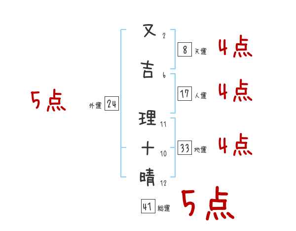 外運![]() | 又吉理十晴さんの外運は24画の5つ星!家庭運が良く順調な人生。金運にも恵まれる。 生活面を象徴する運勢です。外部から受ける影響力を表し、結婚運、家庭運や職場、環境への順応性を表します。 |