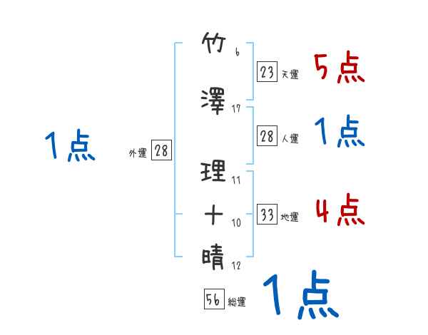 総運![]() | 竹澤理十晴さんの総運は56画の1つ星!消極的で無気力になりがち。誠実な気持ちが必要でしょう。 あなたの人生を表す1番重要な運勢です。生涯を通じて影響する総合運となり、主に50歳以降の晩年期に影響を及ぼします。 |