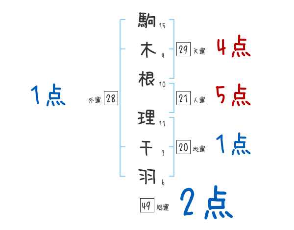 外運![]() | 駒木根理千羽さんの外運は28画の1つ星!家庭環境に注意。スポーツで活躍できる能力があるかも。 生活面を象徴する運勢です。外部から受ける影響力を表し、結婚運、家庭運や職場、環境への順応性を表します。 |