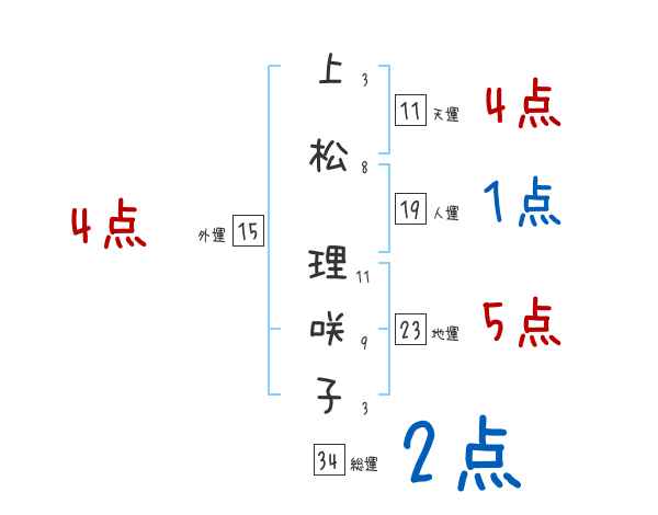 天運![]() | 上松理咲子さんの天運は11画の4つ星!着実に富や地位を得る幸運な人生。 家系が持つ宿命的な運勢を表します。祖先から受け継いだ苗字ですので自分の力が及びません。家柄を象徴します。 |