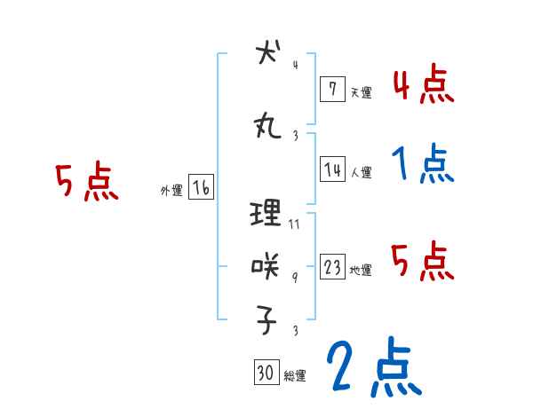 外運![]() | 犬丸理咲子さんの外運は16画の5つ星!人望が厚く大きく発展する。逆転成功が見える。 生活面を象徴する運勢です。外部から受ける影響力を表し、結婚運、家庭運や職場、環境への順応性を表します。 |