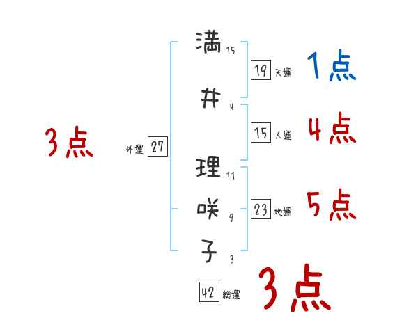 外運![]() | 満井理咲子さんの外運は27画の3つ星!頭脳明晰だが強情で摩擦が多い傾向。孤立に注意。 生活面を象徴する運勢です。外部から受ける影響力を表し、結婚運、家庭運や職場、環境への順応性を表します。 |