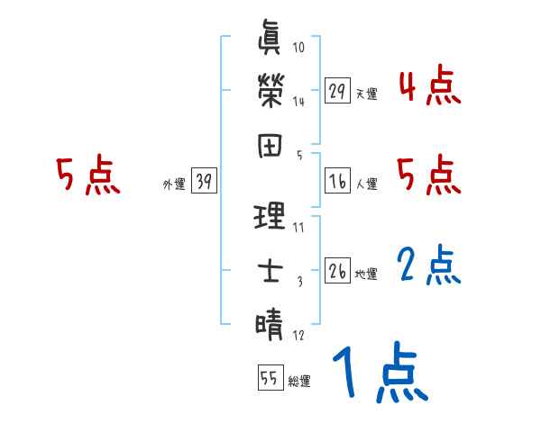 人運![]() | 眞榮田理士晴さんの人運は16画の5つ星!人望が厚く大きく発展する。逆転成功が見える。 性格や才能などを表す2番目に重要な運勢です。人間関係や協調性、社会的な成功に影響します。主に20歳から50歳ぐらいまでの中年期の運勢を表します。 |