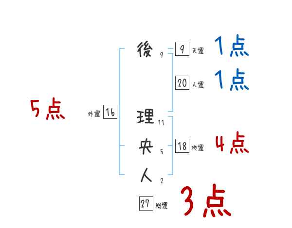 天運![]() | 後理央人さんの天運は9画の1つ星!消極的で才能を発揮することが苦手なことも。周りの意見に耳を傾けましょう。 家系が持つ宿命的な運勢を表します。祖先から受け継いだ苗字ですので自分の力が及びません。家柄を象徴します。 |