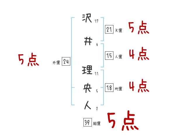 総運![]() | 沢井理央人さんの総運は39画の5つ星!社交性に優れ人望が厚い。人の上に立ち成功する。 あなたの人生を表す1番重要な運勢です。生涯を通じて影響する総合運となり、主に50歳以降の晩年期に影響を及ぼします。 |