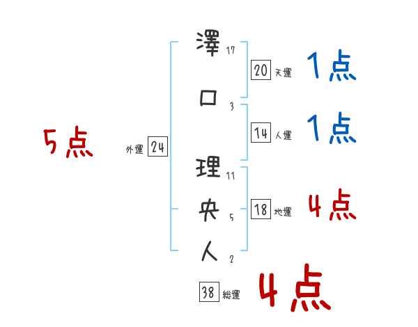 外運![]() | 澤口理央人さんの外運は24画の5つ星!家庭運が良く順調な人生。金運にも恵まれる。 生活面を象徴する運勢です。外部から受ける影響力を表し、結婚運、家庭運や職場、環境への順応性を表します。 |