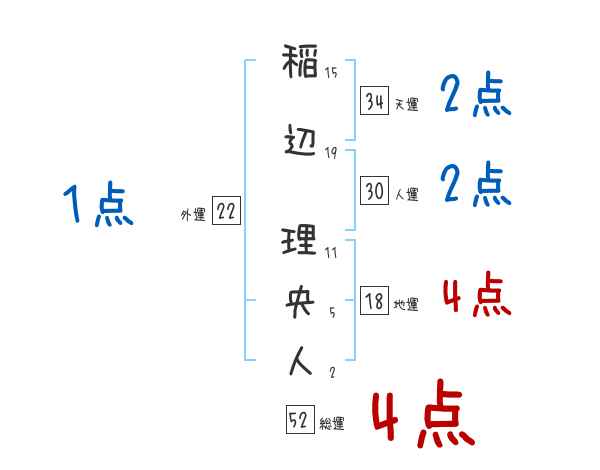 外運![]() | 稲辺理央人さんの外運は22画の1つ星!努力することが苦手ないっぽう手先が器用。芸術性にも優れる。 生活面を象徴する運勢です。外部から受ける影響力を表し、結婚運、家庭運や職場、環境への順応性を表します。 |