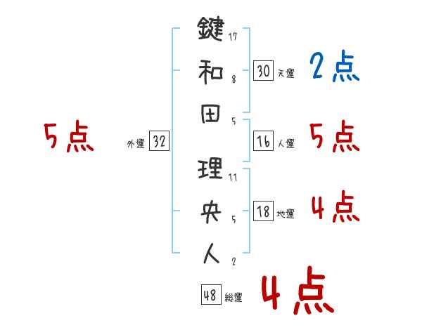外運![]() | 鍵和田理央人さんの外運は32画の5つ星!柔軟性があり成功する。チャンスが多く金運が良い。 生活面を象徴する運勢です。外部から受ける影響力を表し、結婚運、家庭運や職場、環境への順応性を表します。 |