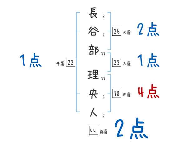天運![]() | 長谷部理央人さんの天運は26画の2つ星!波瀾万丈かも。信頼できる人を大事にしましょう。 家系が持つ宿命的な運勢を表します。祖先から受け継いだ苗字ですので自分の力が及びません。家柄を象徴します。 |