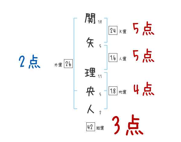 人運![]() | 関矢理央人さんの人運は16画の5つ星!人望が厚く大きく発展する。逆転成功が見える。 性格や才能などを表す2番目に重要な運勢です。人間関係や協調性、社会的な成功に影響します。主に20歳から50歳ぐらいまでの中年期の運勢を表します。 |