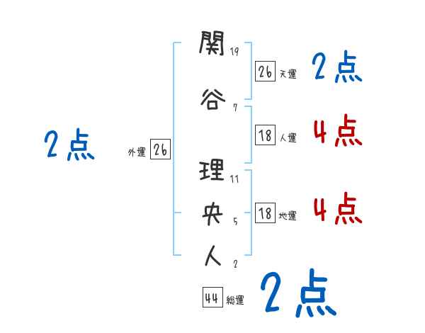 外運![]() | 関谷理央人さんの外運は26画の2つ星!波瀾万丈かも。信頼できる人を大事にしましょう。 生活面を象徴する運勢です。外部から受ける影響力を表し、結婚運、家庭運や職場、環境への順応性を表します。 |