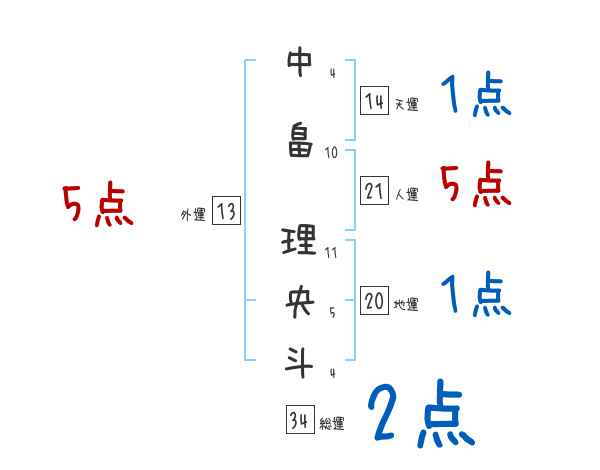 外運![]() | 中畠理央斗さんの外運は13画の5つ星!才能に恵まれ人気がある。名声を手に入れる。円満な人生。 生活面を象徴する運勢です。外部から受ける影響力を表し、結婚運、家庭運や職場、環境への順応性を表します。 |