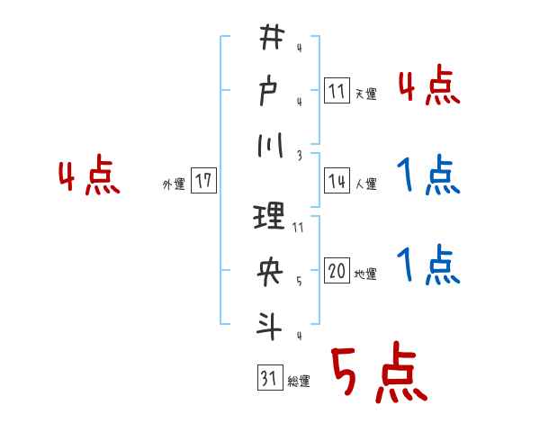 外運![]() | 井戸川理央斗さんの外運は17画の4つ星!積極的な行動力。地位を気づき財産を手に入れる。純粋な心と直感力。 生活面を象徴する運勢です。外部から受ける影響力を表し、結婚運、家庭運や職場、環境への順応性を表します。 |