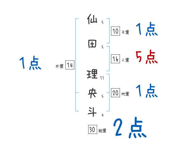 人運![]() | 仙田理央斗さんの人運は16画の5つ星!人望が厚く大きく発展する。逆転成功が見える。 性格や才能などを表す2番目に重要な運勢です。人間関係や協調性、社会的な成功に影響します。主に20歳から50歳ぐらいまでの中年期の運勢を表します。 |