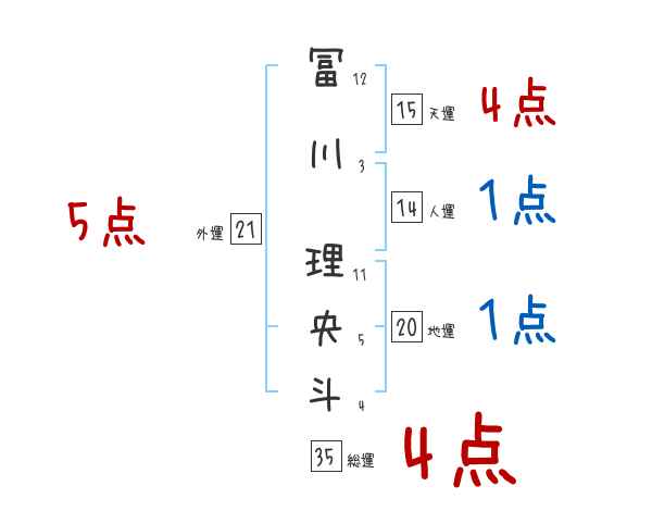 天運![]() | 冨川理央斗さんの天運は15画の4つ星!人徳があり出世する。順調に物事を進め円満な人生。 家系が持つ宿命的な運勢を表します。祖先から受け継いだ苗字ですので自分の力が及びません。家柄を象徴します。 |