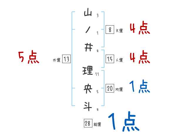 総運![]() | 山ノ井理央斗さんの総運は28画の1つ星!家庭環境に注意。スポーツで活躍できる能力があるかも。 あなたの人生を表す1番重要な運勢です。生涯を通じて影響する総合運となり、主に50歳以降の晩年期に影響を及ぼします。 |