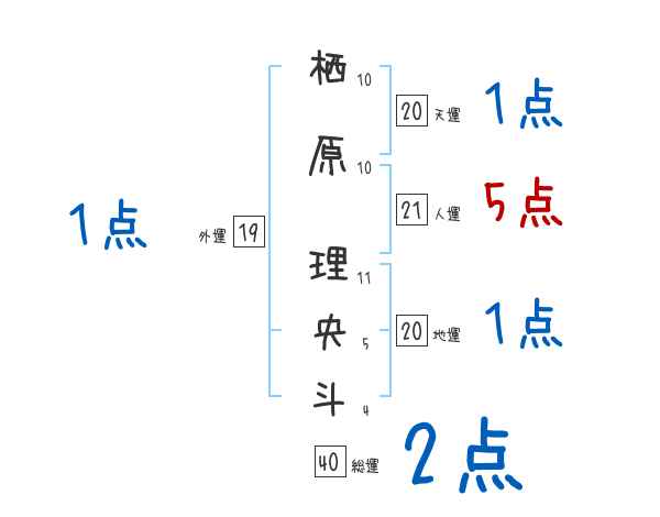 外運![]() | 栖原理央斗さんの外運は19画の1つ星!優れた才能を持ちますが、協調性が足りないことも。周りの人と協力する事を意識しましょう。 生活面を象徴する運勢です。外部から受ける影響力を表し、結婚運、家庭運や職場、環境への順応性を表します。 |