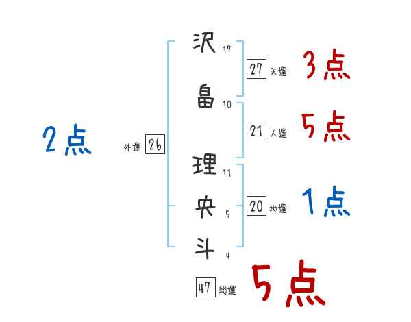 外運![]() | 沢畠理央斗さんの外運は26画の2つ星!波瀾万丈かも。信頼できる人を大事にしましょう。 生活面を象徴する運勢です。外部から受ける影響力を表し、結婚運、家庭運や職場、環境への順応性を表します。 |