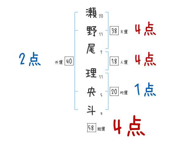 総運![]() | 瀬野尾理央斗さんの総運は58画の4つ星!安定した生活。大器晩成タイプ。 あなたの人生を表す1番重要な運勢です。生涯を通じて影響する総合運となり、主に50歳以降の晩年期に影響を及ぼします。 |