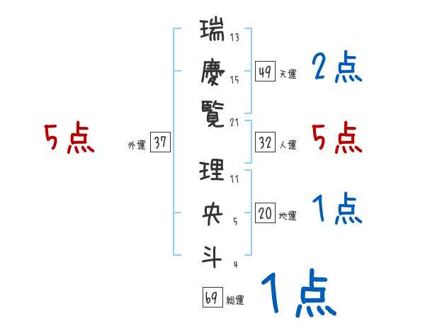 人運![]() | 瑞慶覧理央斗さんの人運は32画の5つ星!柔軟性があり成功する。チャンスが多く金運が良い。 性格や才能などを表す2番目に重要な運勢です。人間関係や協調性、社会的な成功に影響します。主に20歳から50歳ぐらいまでの中年期の運勢を表します。 |
