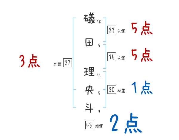 人運![]() | 礒田理央斗さんの人運は16画の5つ星!人望が厚く大きく発展する。逆転成功が見える。 性格や才能などを表す2番目に重要な運勢です。人間関係や協調性、社会的な成功に影響します。主に20歳から50歳ぐらいまでの中年期の運勢を表します。 |