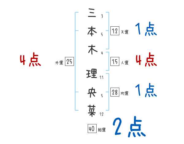 外運![]() | 三本木理央菜さんの外運は25画の4つ星!個性があり才能があふれる。強運の持ち主で発展する。 生活面を象徴する運勢です。外部から受ける影響力を表し、結婚運、家庭運や職場、環境への順応性を表します。 |