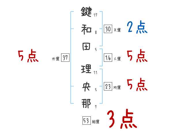 総運![]() | 鍵和田理央那さんの総運は53画の3つ星!やや見栄っ張りで虚栄心がある。散財に注意。 あなたの人生を表す1番重要な運勢です。生涯を通じて影響する総合運となり、主に50歳以降の晩年期に影響を及ぼします。 |