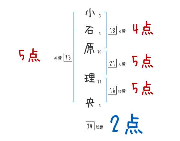 外運![]() | 小石原理央さんの外運は13画の5つ星!才能に恵まれ人気がある。名声を手に入れる。円満な人生。 生活面を象徴する運勢です。外部から受ける影響力を表し、結婚運、家庭運や職場、環境への順応性を表します。 |