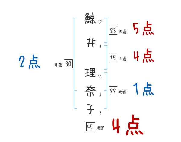天運![]() | 鯨井理奈子さんの天運は23画の5つ星!想像力に優れ活力がある。一代で成功し名誉を手に入れる。 家系が持つ宿命的な運勢を表します。祖先から受け継いだ苗字ですので自分の力が及びません。家柄を象徴します。 |
