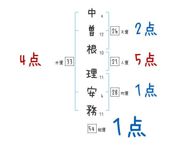 外運![]() | 中曽根理安務さんの外運は33画の4つ星!権力志向でプライドが高い。勇気があり運を切り開き成功する。 生活面を象徴する運勢です。外部から受ける影響力を表し、結婚運、家庭運や職場、環境への順応性を表します。 |