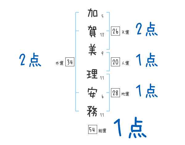 総運![]() | 加賀美理安務さんの総運は54画の1つ星!トラブルが多いかも。周りをよく見て協調して過ごしましょう。 あなたの人生を表す1番重要な運勢です。生涯を通じて影響する総合運となり、主に50歳以降の晩年期に影響を及ぼします。 |