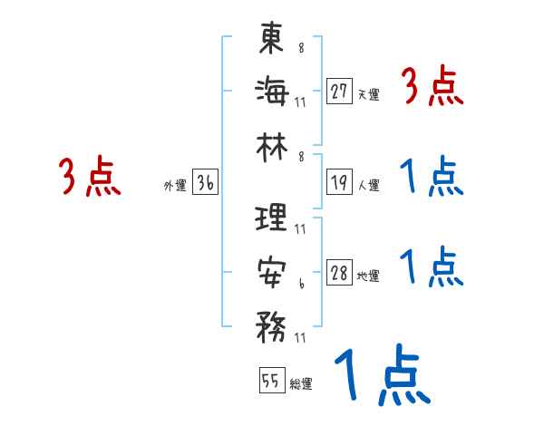 外運![]() | 東海林理安務さんの外運は36画の3つ星!先見性が豊かです。多少神経質で苦労することも。 生活面を象徴する運勢です。外部から受ける影響力を表し、結婚運、家庭運や職場、環境への順応性を表します。 |