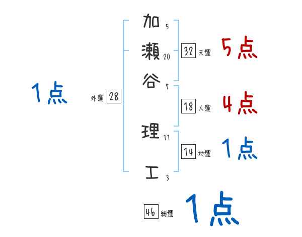 天運![]() | 加瀬谷理工さんの天運は32画の5つ星!柔軟性があり成功する。チャンスが多く金運が良い。 家系が持つ宿命的な運勢を表します。祖先から受け継いだ苗字ですので自分の力が及びません。家柄を象徴します。 |