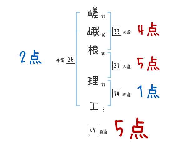 天運![]() | 嵯峨根理工さんの天運は33画の4つ星!権力志向でプライドが高い。勇気があり運を切り開き成功する。 家系が持つ宿命的な運勢を表します。祖先から受け継いだ苗字ですので自分の力が及びません。家柄を象徴します。 |