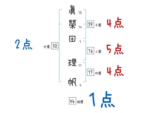 人運![]() | 眞榮田理帆さんの人運は16画の5つ星!人望が厚く大きく発展する。逆転成功が見える。 性格や才能などを表す2番目に重要な運勢です。人間関係や協調性、社会的な成功に影響します。主に20歳から50歳ぐらいまでの中年期の運勢を表します。 |