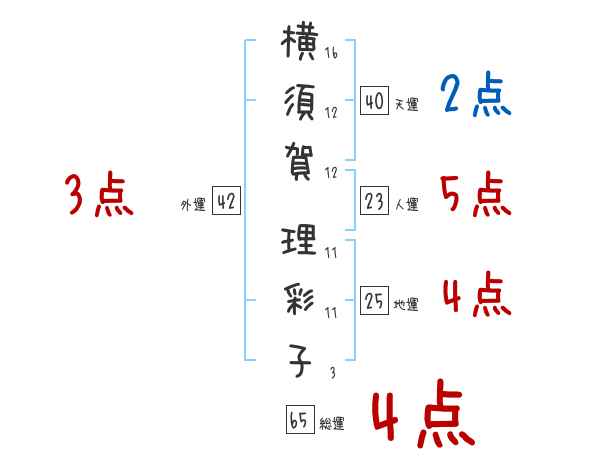 外運![]() | 横須賀理彩子さんの外運は42画の3つ星!病気に注意。多芸であるが消極的でおとなしい。 生活面を象徴する運勢です。外部から受ける影響力を表し、結婚運、家庭運や職場、環境への順応性を表します。 |